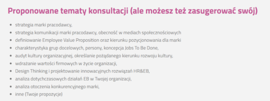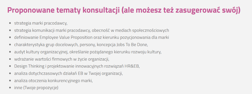 A jeśli czujesz, że Twoja firma jest gotowa na podobną podróż – czy to w obszarze strategii EB, kultury organizacyjnej czy innowacyjnych rozwiązań HR & EB – koniecznie daj znać. Umów się na bezpłatne konsultacje HR & EB. Już w trakcie pierwszej godziny podpowiem Ci jakie strategiczne kroki warto podjąć by przybliżyć markę do oczekiwanej zmiany.