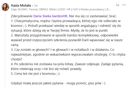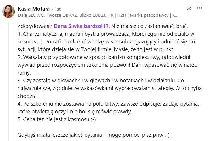 Wasze słowa to dla mnie największa nagroda i potwierdzenie, że to, co robię realnie rozwija organizacje. Dziękuję za każdą rekomendację – to dzięki Wam wiem, że moja energia, pasja i zaangażowanie przekładają się na realne zmiany, które potrzebne są tak biznesowi, jak i pracujących w nich ludziom.
