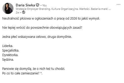 Wprowadzenie zmian w komunikacji to przede wszystkim test dla kultury organizacji. Największą barierą jest często opór językowy i kulturowy dyskomfort u niektórych osób przy stosowaniu form typu „osoba asystencka”. Pracodawcy obawiają się, że język neutralny zostanie odebrany przez rynek jako sztuczny lub ideologiczny. Niektórzy z nich głośno argumentują swoje niezadowolenie. Nie wierzysz? Koniecznie zwróć uwagę na ilość komentarzy negatywnych pod moim postem: